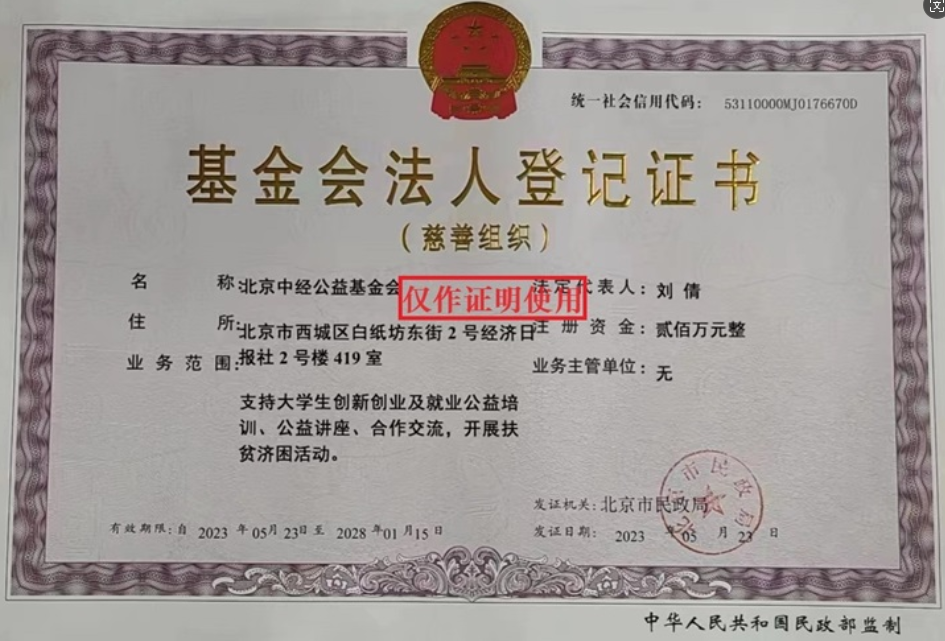 北京中经公益基金会慈善组织法人登记证书